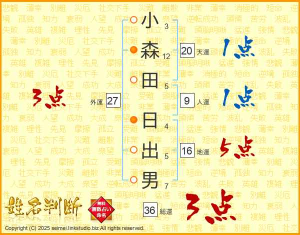 小(3画)森(12画)田(5画) 日(4画)出(5画)男(7画)