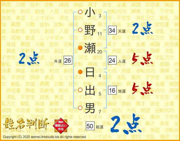 小(3画)野(11画)瀬(20画) 日(4画)出(5画)男(7画)