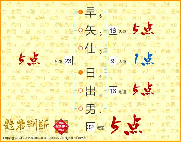 早(6画)矢(5画)仕(5画) 日(4画)出(5画)男(7画)