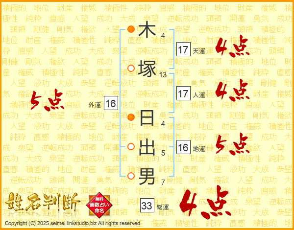 木(4画)塚(13画) 日(4画)出(5画)男(7画)