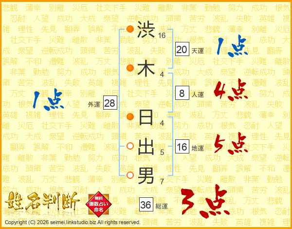 渋(16画)木(4画) 日(4画)出(5画)男(7画)