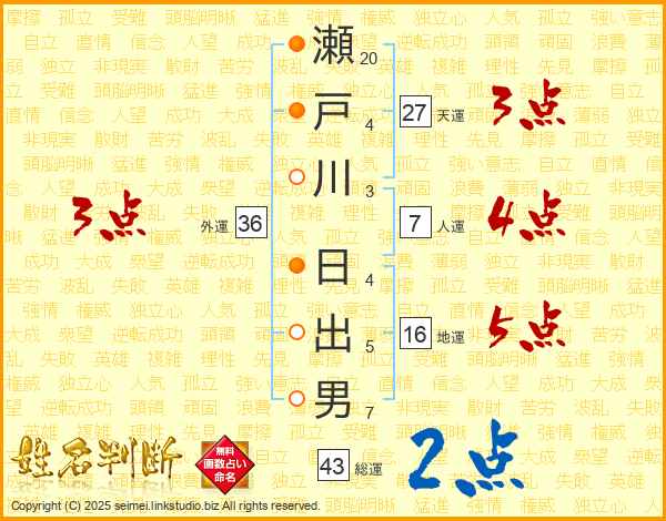瀬(20画)戸(4画)川(3画) 日(4画)出(5画)男(7画)