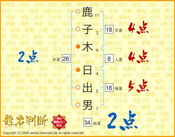 鹿(11画)子(3画)木(4画) 日(4画)出(5画)男(7画)