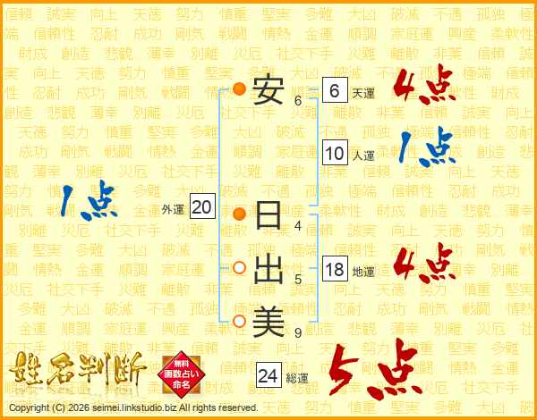 生活面を象徴する運勢です。外部から受ける影響力を表し、結婚運、家庭運や職場、環境への順応性を表します。総運から人運を引いた画数。姓や名が1文字の場合を除く。