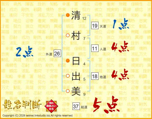 清(12画)村(7画) 日(4画)出(5画)美(9画)