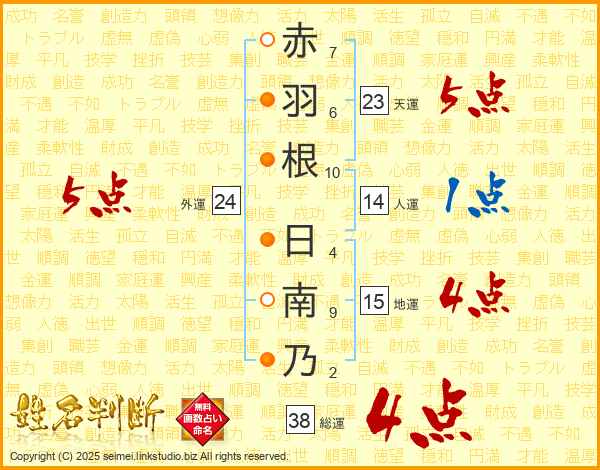赤(7画)羽(6画)根(10画) 日(4画)南(9画)乃(2画)