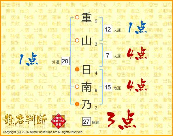 重(9画)山(3画) 日(4画)南(9画)乃(2画)