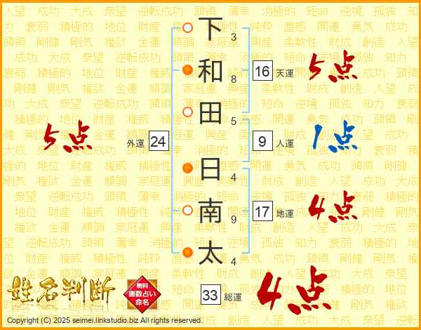 下(3画)和(8画)田(5画) 日(4画)南(9画)太(4画)