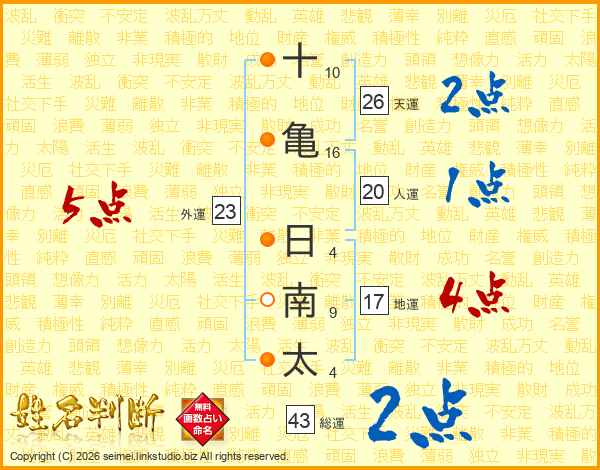 十(10画)亀(16画) 日(4画)南(9画)太(4画)