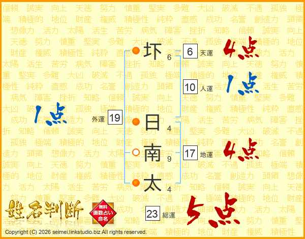 生活面を象徴する運勢です。外部から受ける影響力を表し、結婚運、家庭運や職場、環境への順応性を表します。総運から人運を引いた画数。姓や名が1文字の場合を除く。