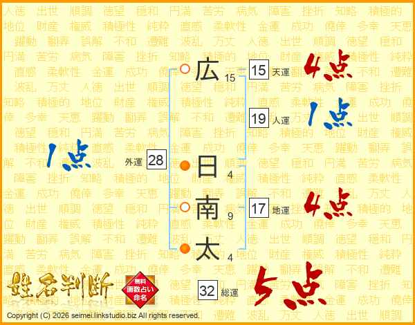 生活面を象徴する運勢です。外部から受ける影響力を表し、結婚運、家庭運や職場、環境への順応性を表します。総運から人運を引いた画数。姓や名が1文字の場合を除く。