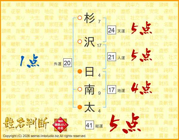 杉(7画)沢(17画) 日(4画)南(9画)太(4画)