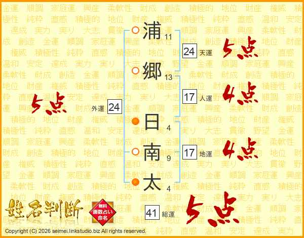 浦郷日南太さんの外運は24画の5点!