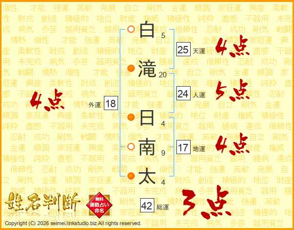 白(5画)滝(20画) 日(4画)南(9画)太(4画)