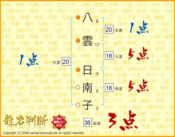 八雲日南子さんの総運は36画の3点!