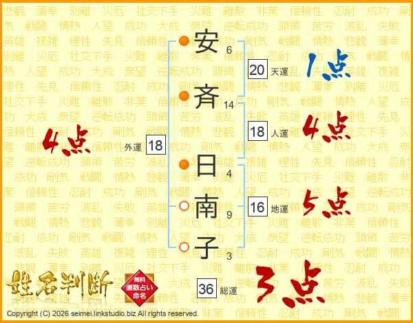 安(6画)斉(14画) 日(4画)南(9画)子(3画)