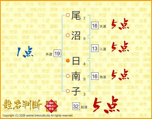 尾沼日南子さんの総運は32画の5点!