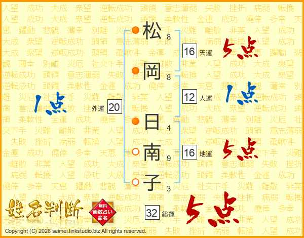 松(8画)岡(8画) 日(4画)南(9画)子(3画)