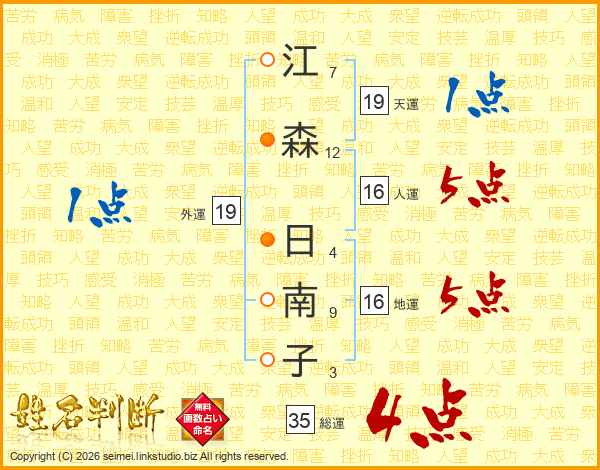 江(7画)森(12画) 日(4画)南(9画)子(3画)