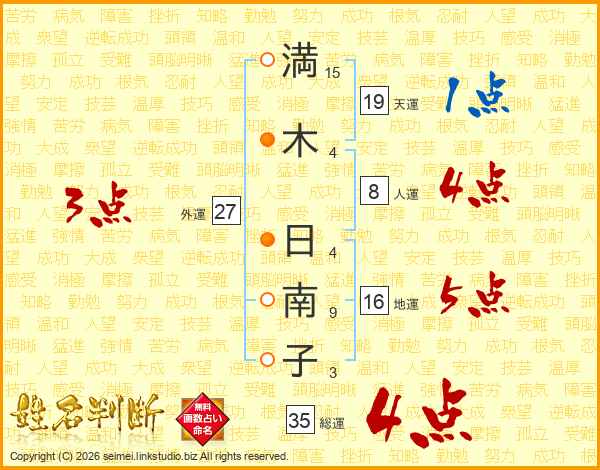 満(15画)木(4画) 日(4画)南(9画)子(3画)