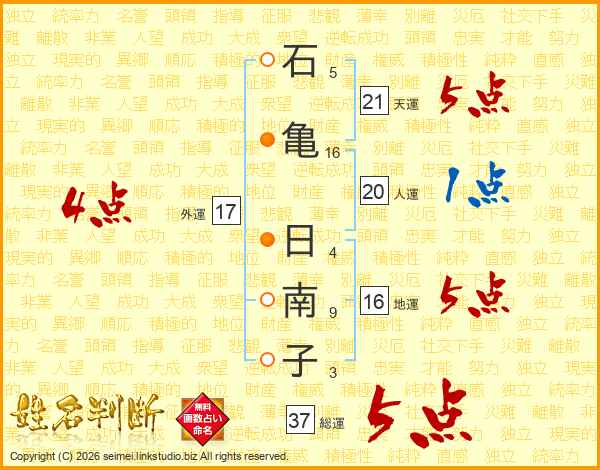 石(5画)亀(16画) 日(4画)南(9画)子(3画)