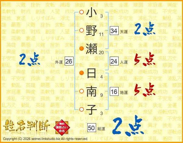 小(3画)野(11画)瀬(20画) 日(4画)南(9画)子(3画)