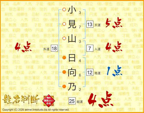 小(3画)見(7画)山(3画) 日(4画)向(6画)乃(2画)