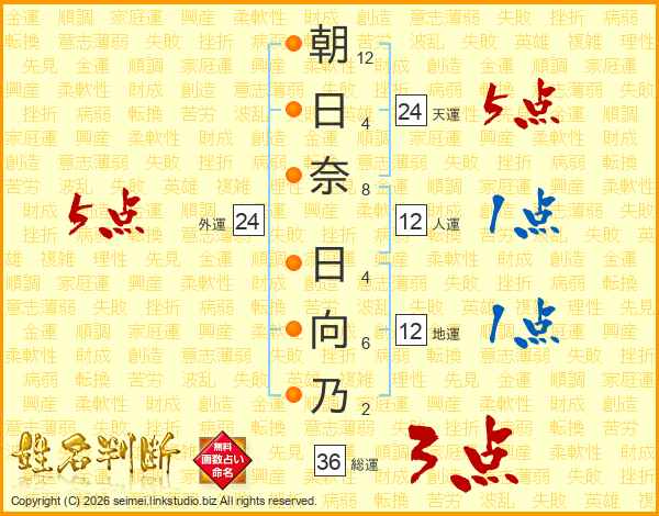 朝(12画)日(4画)奈(8画) 日(4画)向(6画)乃(2画)