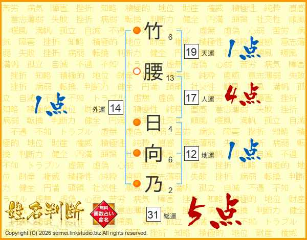 竹(6画)腰(13画) 日(4画)向(6画)乃(2画)