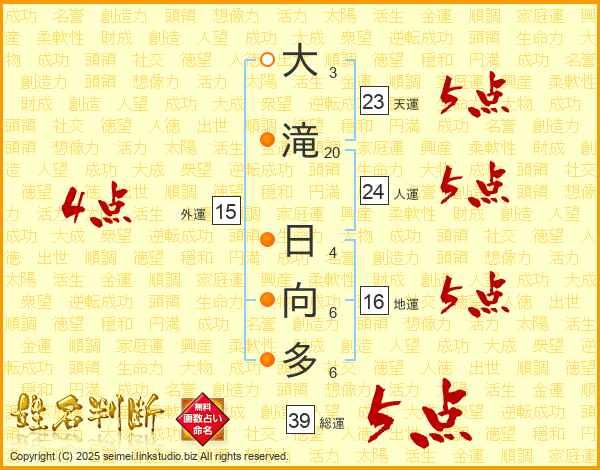 大(3画)滝(20画) 日(4画)向(6画)多(6画)