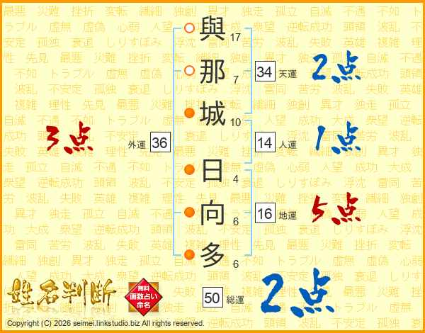 生活面を象徴する運勢です。外部から受ける影響力を表し、結婚運、家庭運や職場、環境への順応性を表します。総運から人運を引いた画数。姓や名が1文字の場合を除く。