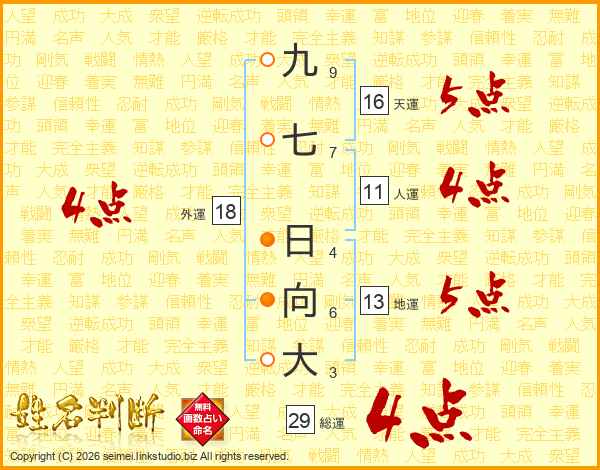 九七日向大さんの総運は29画の4点!