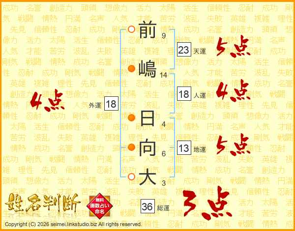 前(9画)嶋(14画) 日(4画)向(6画)大(3画)