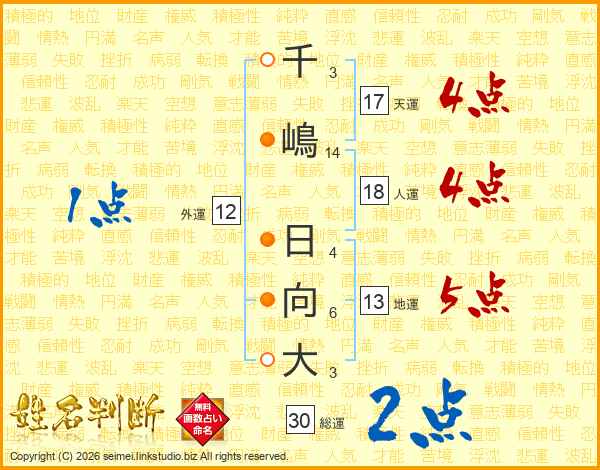 千(3画)嶋(14画) 日(4画)向(6画)大(3画)