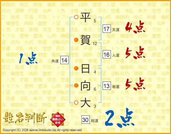 平(5画)賀(12画) 日(4画)向(6画)大(3画)