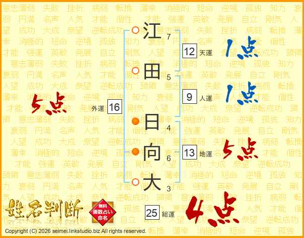 生活面を象徴する運勢です。外部から受ける影響力を表し、結婚運、家庭運や職場、環境への順応性を表します。総運から人運を引いた画数。姓や名が1文字の場合を除く。
