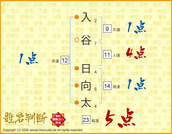 生活面を象徴する運勢です。外部から受ける影響力を表し、結婚運、家庭運や職場、環境への順応性を表します。総運から人運を引いた画数。姓や名が1文字の場合を除く。