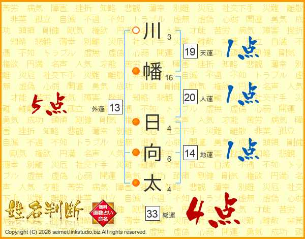 川幡日向太さんの総運は33画の4点!