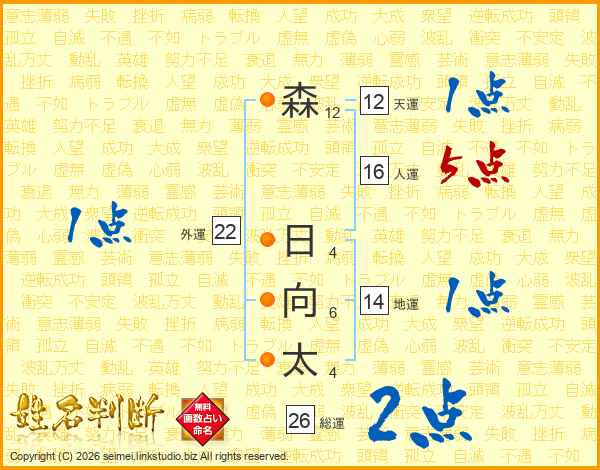 あなたの人生を表す1番重要な運勢です。生涯を通じて影響する総合運となり、主に50歳以降の晩年期に影響を及ぼします。苗字と名前の合計画数。