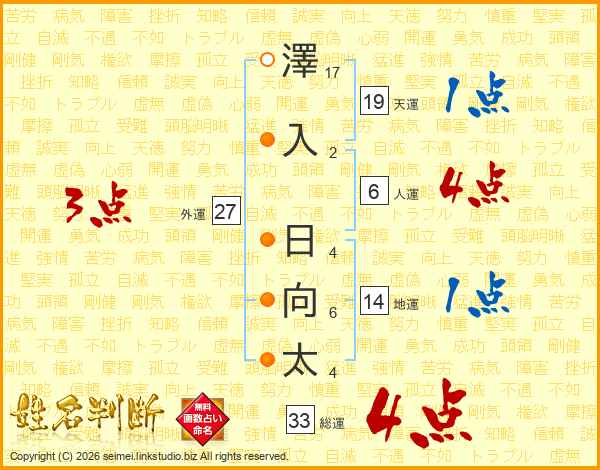 澤(17画)入(2画) 日(4画)向(6画)太(4画)