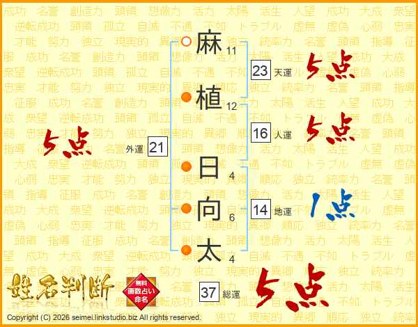 麻(11画)植(12画) 日(4画)向(6画)太(4画)