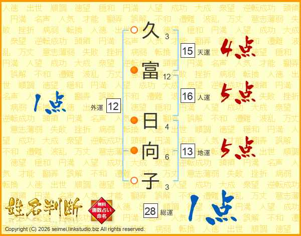 久(3画)富(12画) 日(4画)向(6画)子(3画)