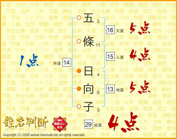 生活面を象徴する運勢です。外部から受ける影響力を表し、結婚運、家庭運や職場、環境への順応性を表します。総運から人運を引いた画数。姓や名が1文字の場合を除く。