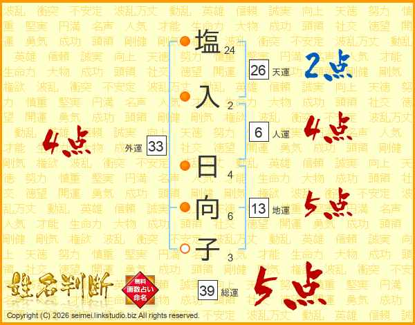 塩(24画)入(2画) 日(4画)向(6画)子(3画)