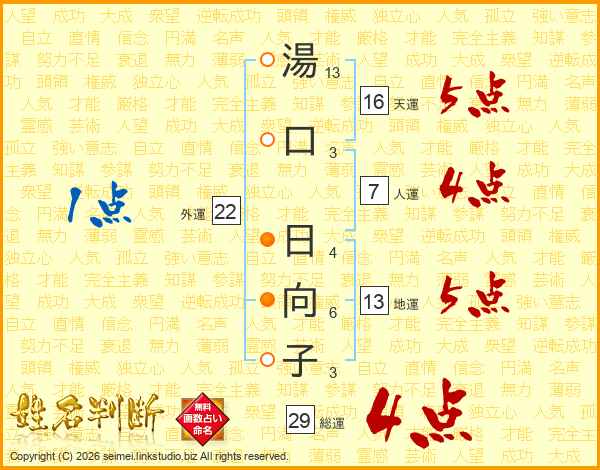 湯(13画)口(3画) 日(4画)向(6画)子(3画)