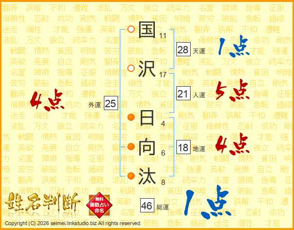 国(11画)沢(17画) 日(4画)向(6画)汰(8画)