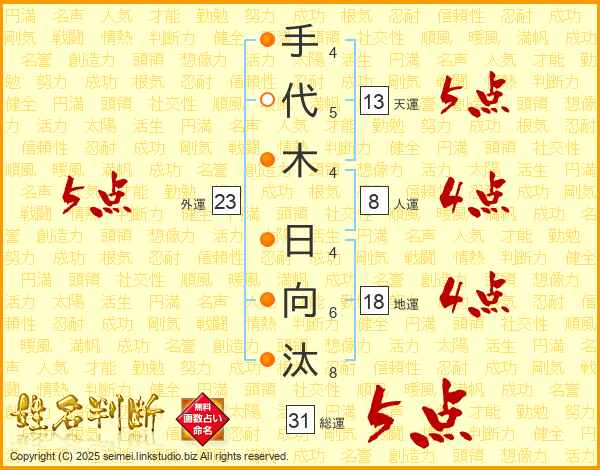 手(4画)代(5画)木(4画) 日(4画)向(6画)汰(8画)