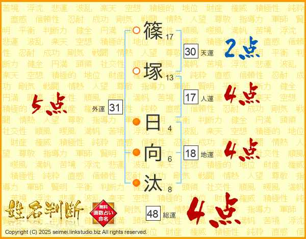 篠(17画)塚(13画) 日(4画)向(6画)汰(8画)