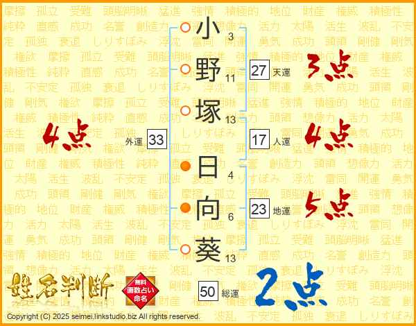 小(3画)野(11画)塚(13画) 日(4画)向(6画)葵(13画)