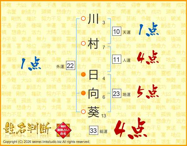 川村日向葵さんの総運は33画の4点!
